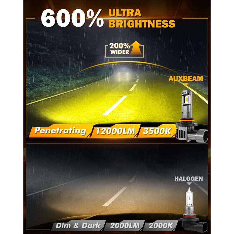 - 600% ULTRA BRIGHTNESS: Upgraded double-sided 16 PCs 5530 CSP chips, Voltage: 9V-12V(DC), 12000 lumen per set, 600% penetrating brightness, 200% wider vision, 3500K golden yellow focused beam, cutting through dense fog and heavy rain with ease
