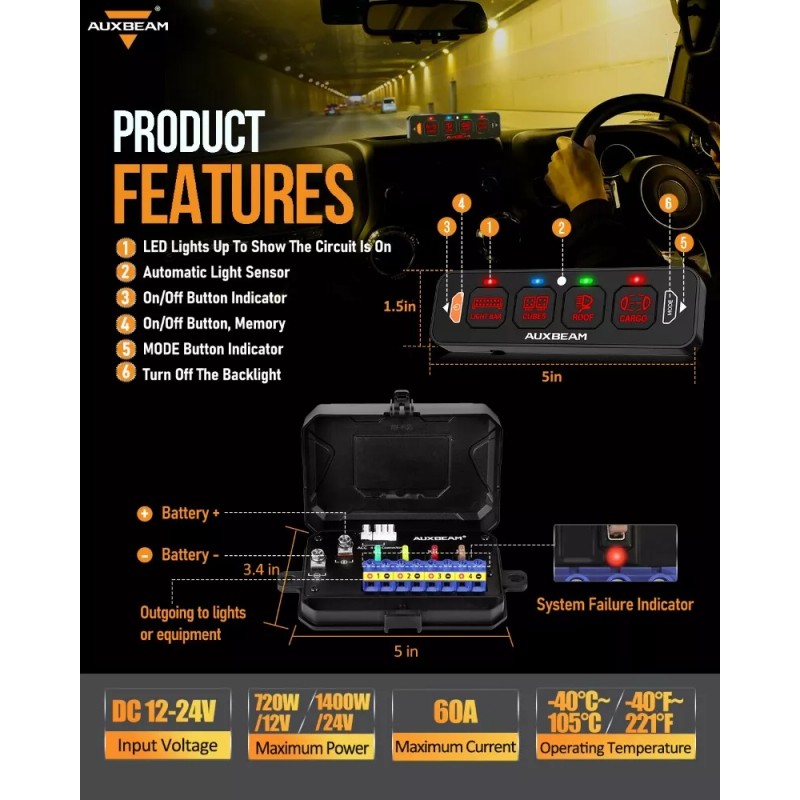 4 Gang one-sided outlet switch panel. It allows you to control up to 4 different LED lights or devices. Command all your vehicle accessories by the tap of your finger.