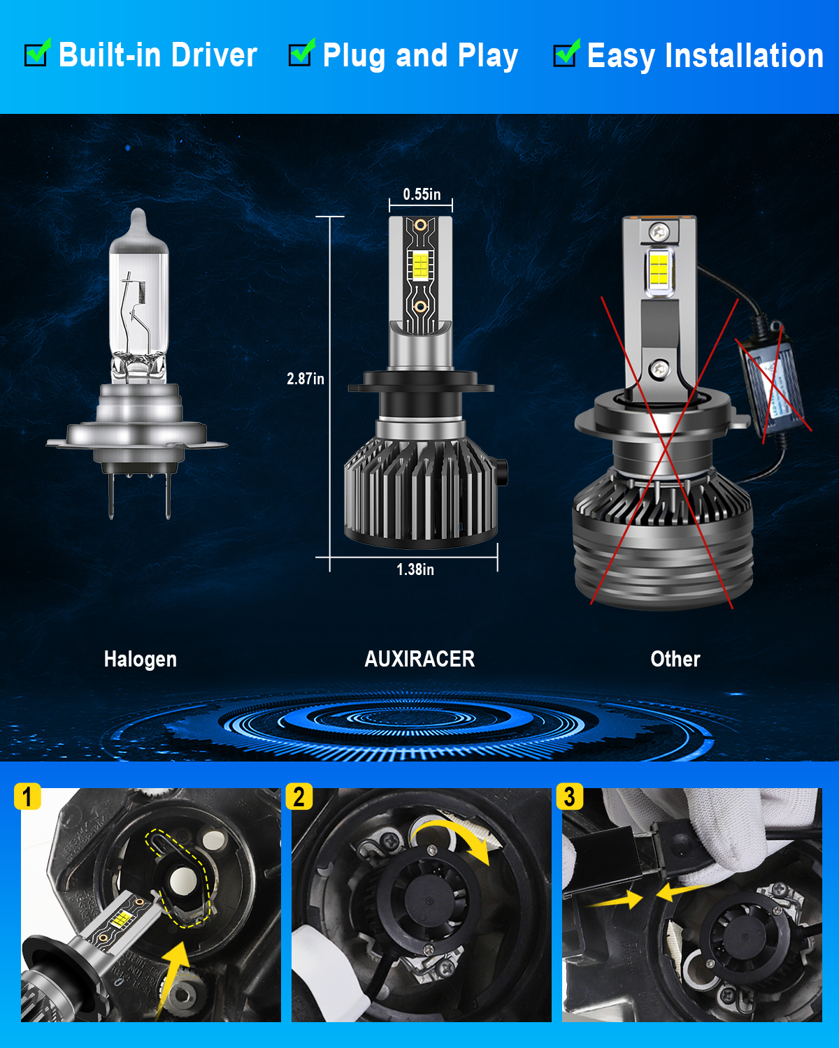 5-MINUTE INSTALLATION: All-in-one design, bulid-in driver for taking up less space in housing, no bulky external driver, no extended bulb base, no more modification on housing or cover. Real plug and play, smoothly fits into vehicle's housing and factory sockets even with limited space in original housing.