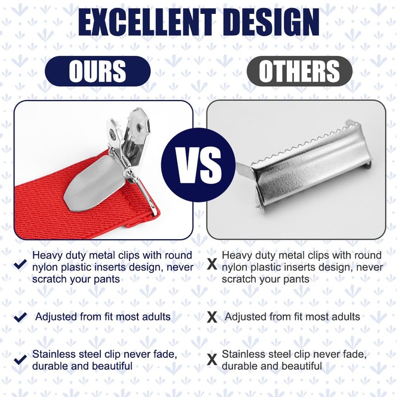 - Reliable hold: durable alloy buckle design, stainless steel metal clip with plastic teeth can prevent the trousers from being damaged, while preventing slipping. The suspenders have sturdy clips at both ends for easy handling and secure attachment to jeans or trousers. Durable tote bags are made of high density elastic material for comfort and durability. The hand-stitched leather is thick, soft and does not fade.
