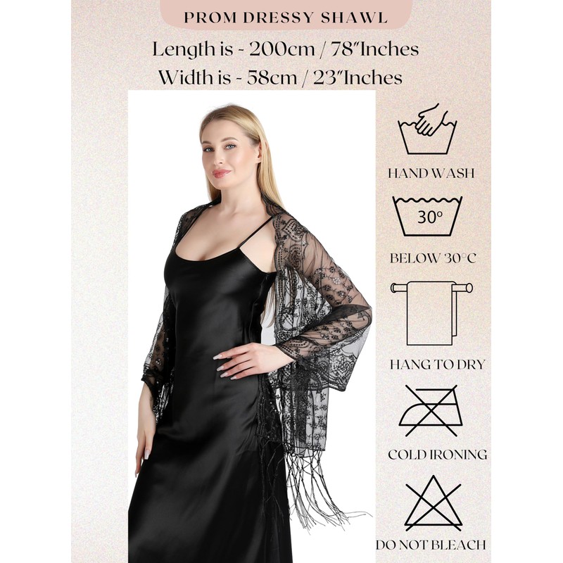 - Material: Made from high-quality polyester, sequins, and fringe, the shawl is both lightweight and breathable, ensuring comfort for long wear.