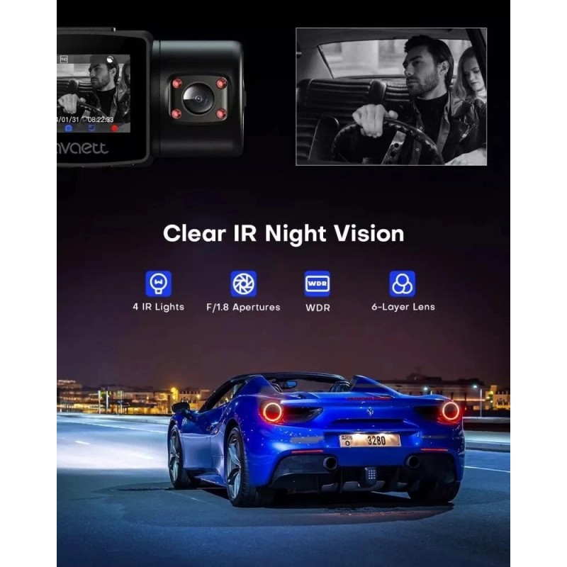 - 🚨【WDR & Infrared Night Vision】: The dashcam front and inside is equipped with CMOS sensor and F1.8 aperture lens, offering outstanding video quality even in low-light conditions. The WDR technology can reduce noise and motion blur, balancing the bright and dark areas, enabling clear video capture. It also features 4 infrared LED light to enhance night vision, ensure perfect video footage even when the cabin is dark.