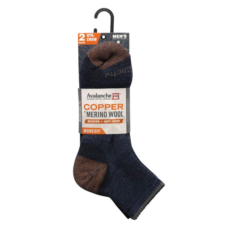 Avalanche Men's Odor Resistant Copper Wool Blend Quarter Socks With Arch Support 2Pack Navy/Charcoal 10-13