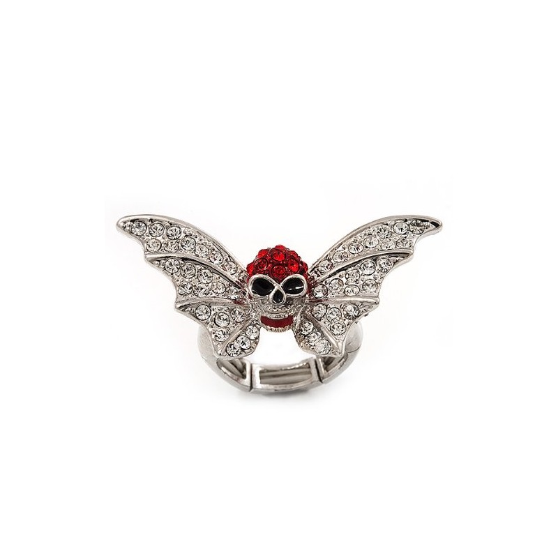 Avalaya Clear/Red Crystal Skull and Wings Stretch Ring/Silver Tone/4.5cm Across/Size 8/9