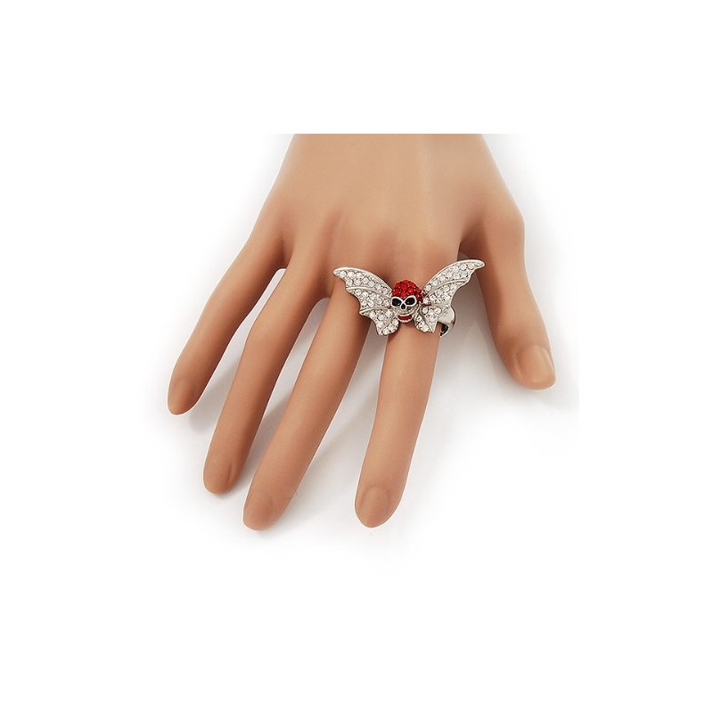 Avalaya Clear/Red Crystal Skull and Wings Stretch Ring/Silver Tone/4.5cm Across/Size 8/9