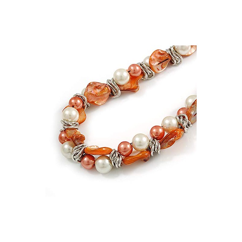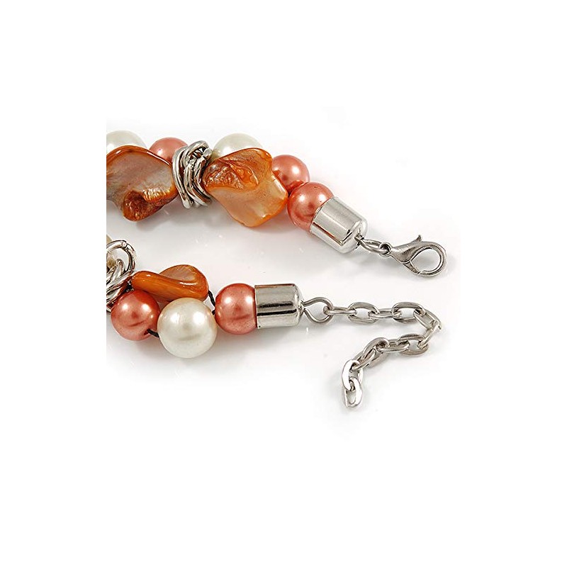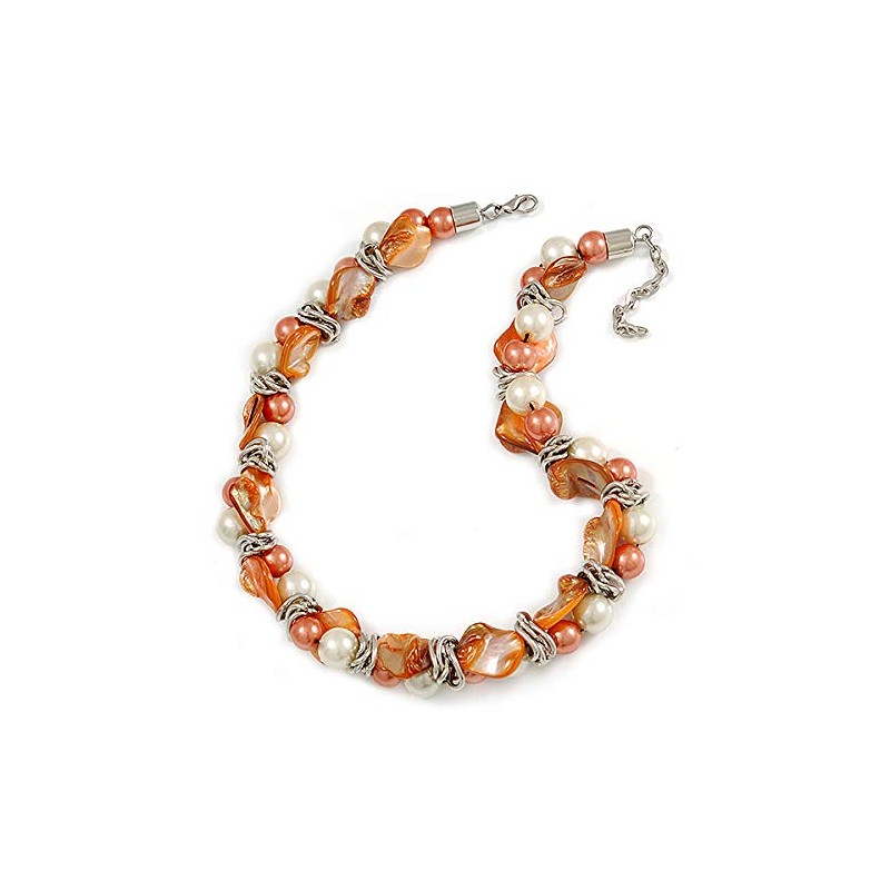 Avalaya Exquisite Faux Pearl & Shell Composite Silver Tone Link Necklace In Peach Orange/White - 40cm L/ 5cm Ext