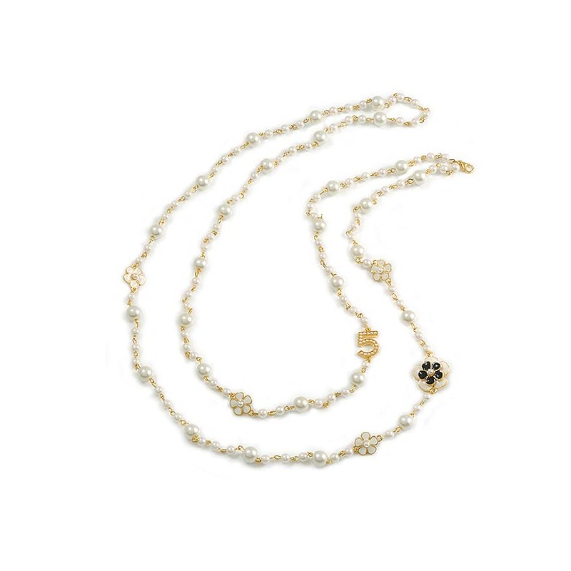 Avalaya Faux Pearl White Bead With White/Black Enamel Daisy Motif Double Chain Long Necklace in Gold Tone - 86cm L
