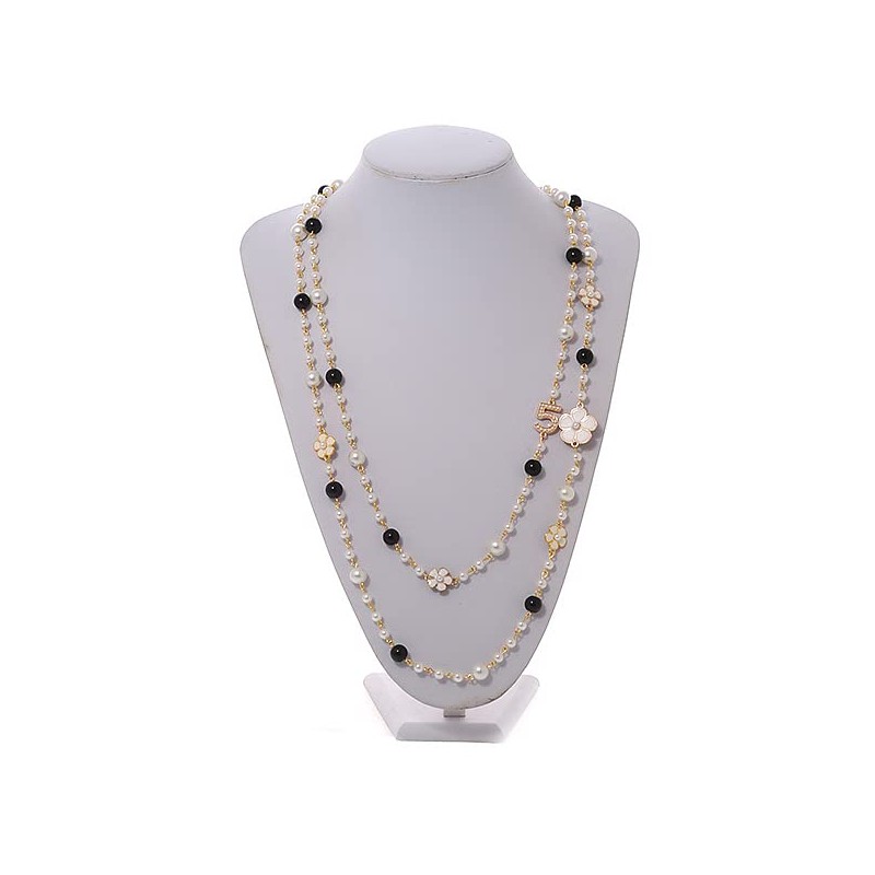 Avalaya Faux Pearl White/Black Bead With Black/White Enamel Daisy Motif Double Chain Long Necklace in Gold Tone - 86cm L
