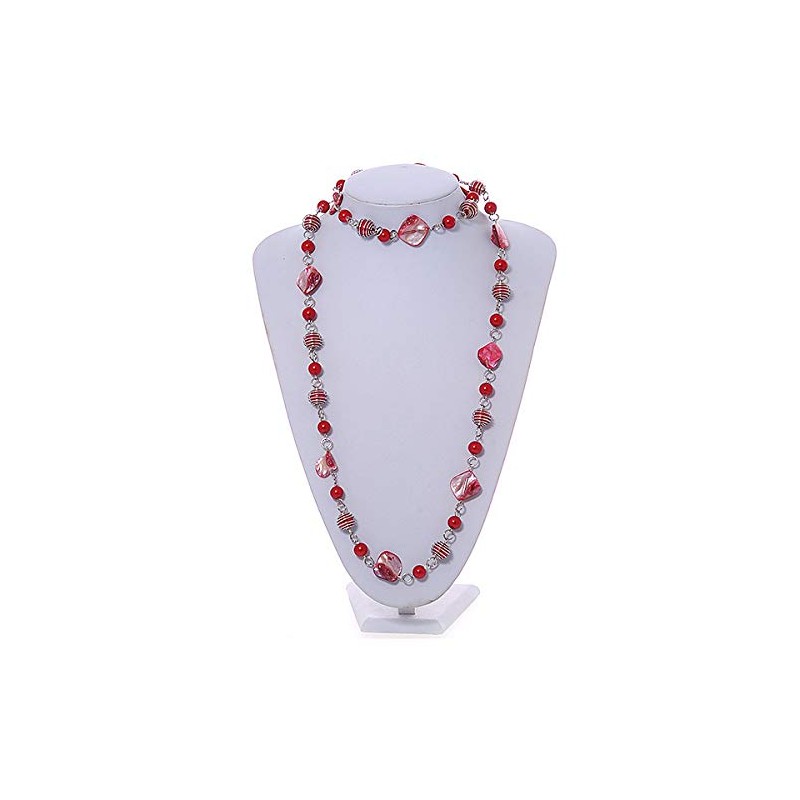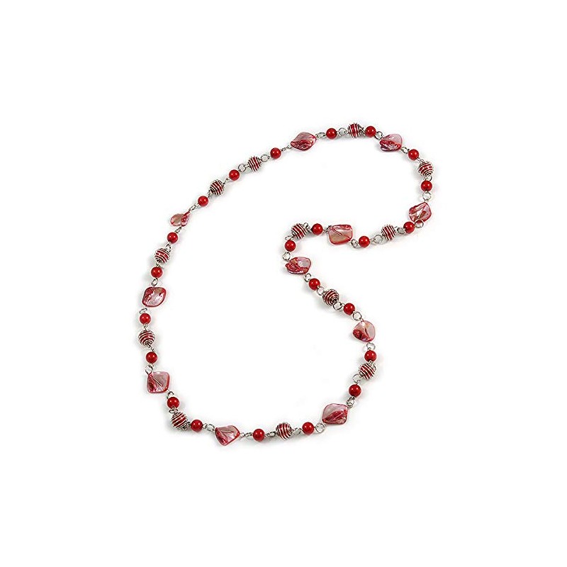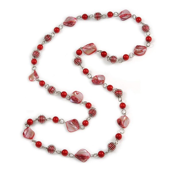 Avalaya Glass and Shell Bead with Silver Tone Metal Wire Element Extra Long Necklace In Red - 120cm