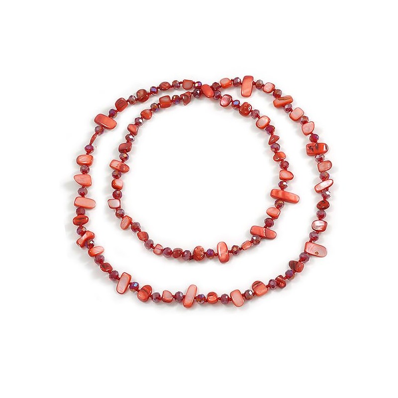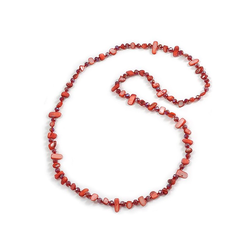 Avalaya Long Imperial Red Shell Nugget and Dark Red Faceted Glass Bead Necklace - 112cm Long