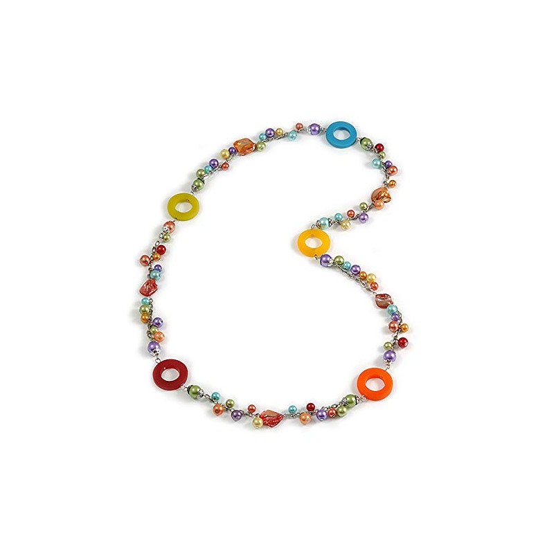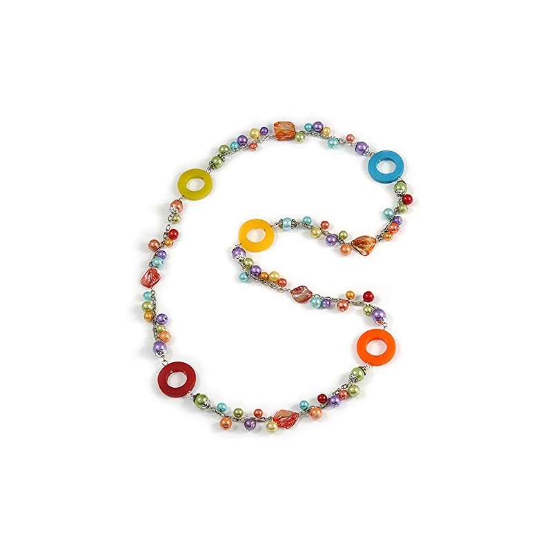 Pull your look together in this stylish Long Multicoloured Pearl, Shell and Resin Ring with Silver Tone Chain Necklace. It features a long strand, made of multicoloured pearl beads, shell nuggets and resin rings. The necklace measures about 104cm in length. And an easy-to-wear, no fastening so can be slipped over the head. A must have item for those serious about wearing costume jewellery and also makes a perfect gift. This product does not contain any natural pearls.