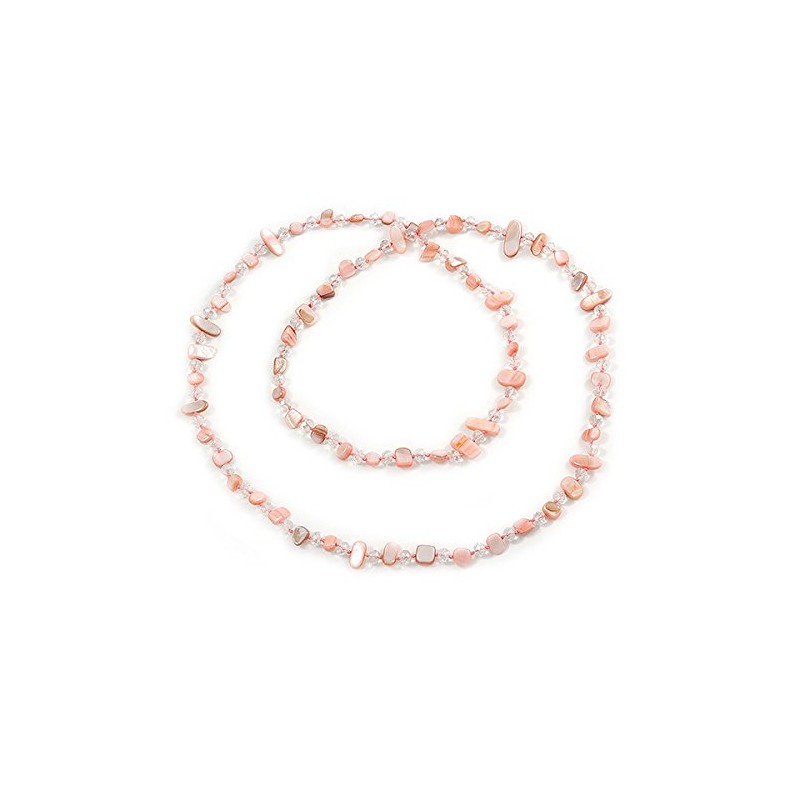 Avalaya Long Pastel Pale Pink/Transparent Shell Nugget and Glass Crystal Bead Necklace - 110cm L