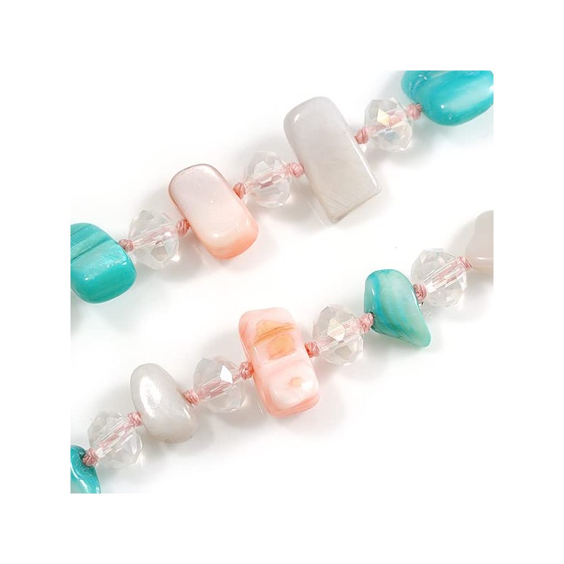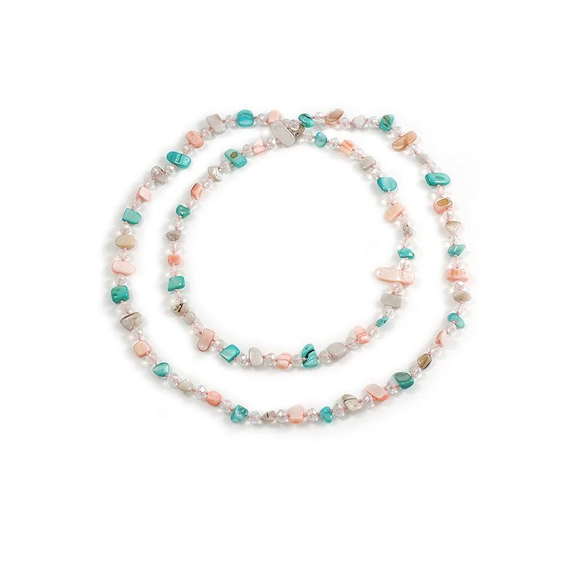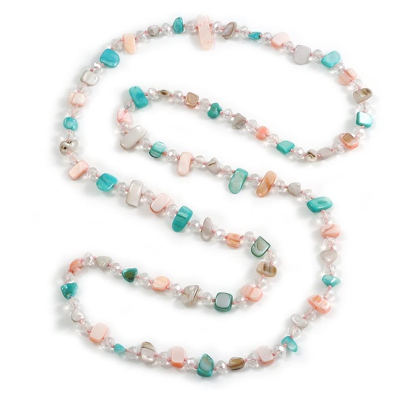 Avalaya Pastel Pink/Teal/Off White Shell Nugget and Transparent Glass Bead Long Necklace - 115cm Long