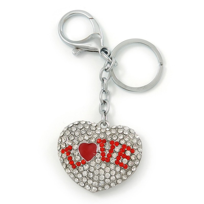 Avalaya Rhodium Plated Clear Crystal 'Love' Puffed Heart Keyring/Bag Charm - 85mm Length