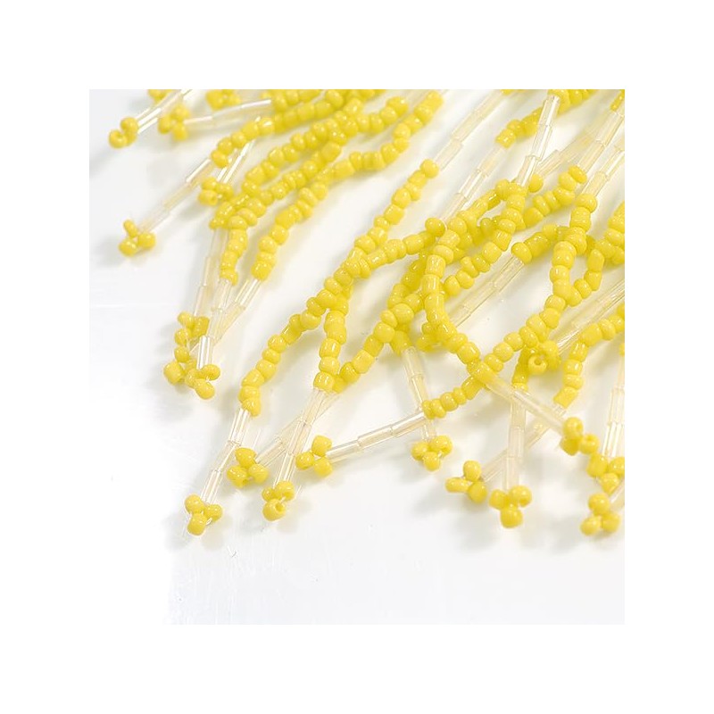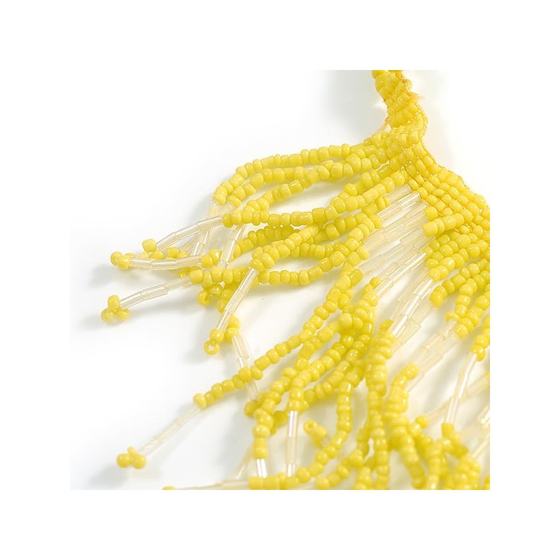Add a touch of dramatic styling to your outfit with this Statement Glass Bead Bib Style/ Fringe Necklace In Yellow/Transparent Colours. Featuring a bold fringe design, made of small glass beads in hues of yellow/transparent. The necklace measures about: 38cm Long, 15cm Front Drop. Fastens with a button and double loop detail to keep this stunning piece securely around your neck.