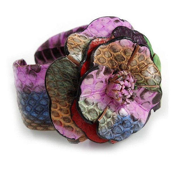 Avalaya Statement Multicoloured Snake Print Leather Flower Flex Cuff Bangle Bracelet - Adjustable