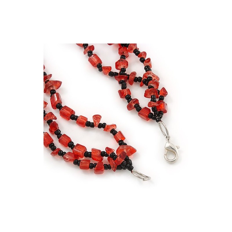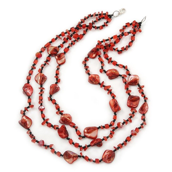 Avalaya Three-Strand Necklace with Red & Black Glass and Shell Beads – 60cm Length – Bold & Elegant