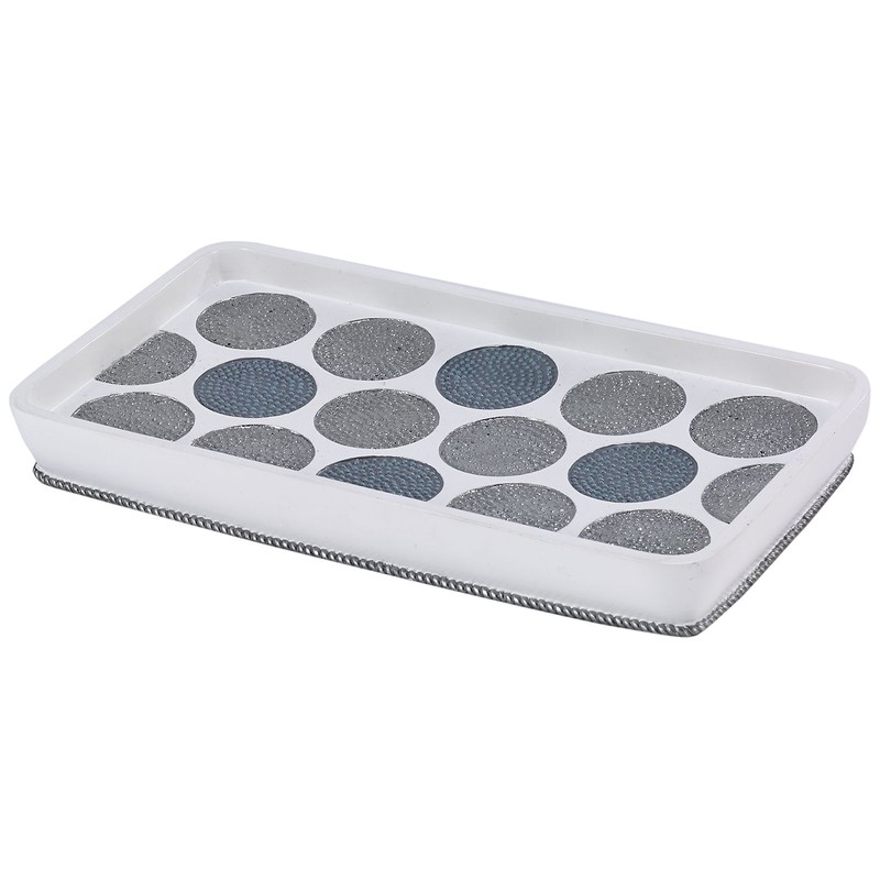Beautifully executed in grey and blue with metallic accents on a White base in durable resin, the Avanti dotted circles tray adds a contemporary flair to any bathroom, bedroom, kitchen or office. Imported. Coordinating shower curtain, rug and towels also available. Imported.