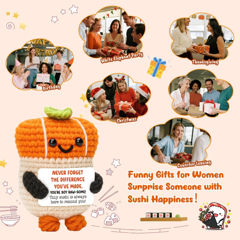 - Ideal Crochet Gifts for All Occasion:Whether you're saying thank you,goodbye,or simply sending a little sunshine someone's way,this handmade crochet sushi is a meaningful gift for every occasion.Ideal for office farewells,encouragement gifts,Christmas gifts,white elephant gift or just because.This tiny sushi is a heartwarming way to show gratitude and support to coworkers,office teammates,teachers,nurses,mentors,or friends who’ve made a difference. A versatile choice for both women and men
