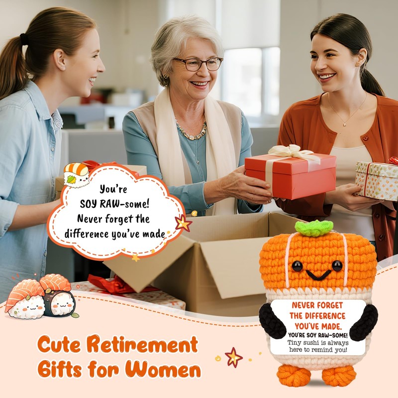 - Farewell/Goodbye/Retirement Gifts for coworkers:Send your best wishes with a unique and heartfelt goodbye.This emotional crochet sushi holds a heartfelt message:"Never forget the difference that you’ve made."This crochet sushi with its encouraging card makes the perfect farewell gift for coworkers,coworker leaving gifts for women,combining humor and appreciation in one.Whether she’s retiring,switching jobs,or moving away,this thoughtful gift makes her feel remembered.