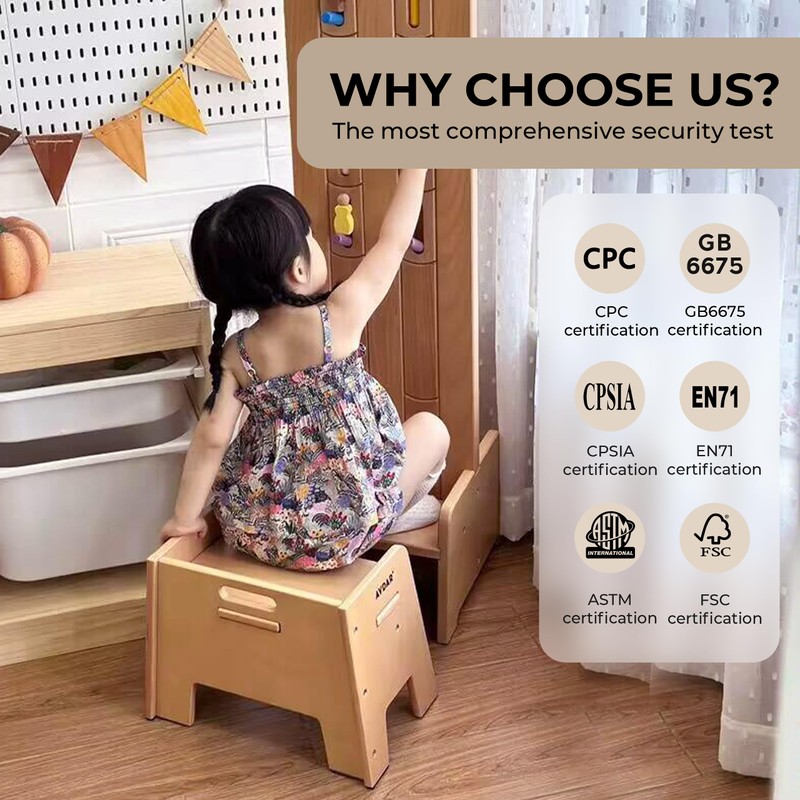 - Safe and Reliable Materials: Our kitchen step stool is constructed from durable, E0-grade, multi-layer birchwood, carefully coated with non-toxic, water-based paint that is free of harmful substances like formaldehyde. Our products have earned certifications from the EU Toy Safety EN71, Chinese Toy Safety GB6675, US ASTM and CPSIA, as well as the FSC certification, ensuring safety, reliability, and long-lasting durability.