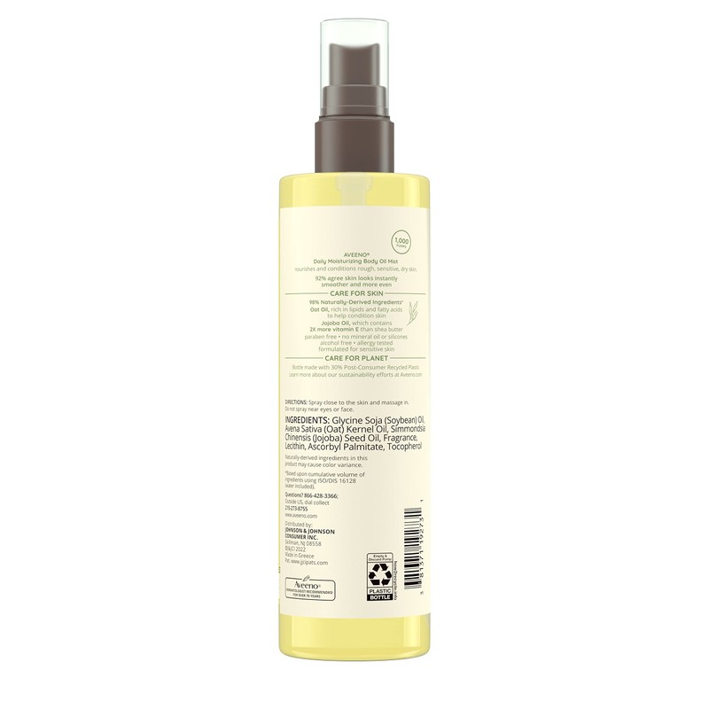 Condition and nourish your skin with Aveeno Daily Moisturizing Dry Oil Mist. Ideal for rough, sensitive dry skin care, this hydrating body oil spray helps to moisturize rough, dry skin. This body oil for sensitive skin comes in a convenient spray bottle for easy application. As part of a dermatologist-recommended brand with over 70 years of expertise, this daily moisturizing body spray boasts a hypoallergenic formula and is free of parabens, phthalates, silicones, mineral oil, synthetic dyes & alcohol. Infused with naturally derived ingredients* like oat oil, rich in lipids and fatty acids to help condition the skin. Additionally, jojoba oil, containing 2x more vitamin E than shea butter. Use this oil for dry skin daily as part of your skincare routine by spraying the dry oil mist close to your skin and massaging it in. Avoid spraying the oil near your eyes or face for optimal safety and comfort. *based upon cumulative volume of ingredients using ISO/DIS 16128 (water included).
