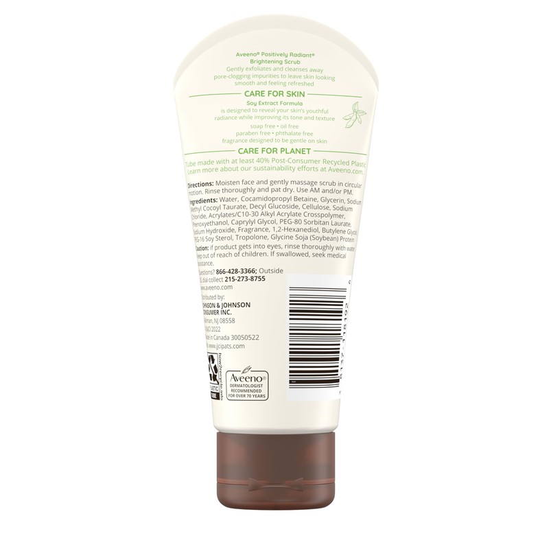 Aveeno positively Radiant skin brightening exfoliating face scrub, gently remove impurities for softer, brighter, more even-toned skin with Aveeno positively Radiant skin brightening daily Scrub. This brightening facial scrub gently exfoliates skin and helps improve tone, texture, and clarity to reveal brighter, more radiant skin. It's designed to help improve dullness and blotchiness, so your skin looks and feels fresh. The unique formula of this gentle face scrub combines moisture-rich soy extract with naturally derived granules to exfoliate while you cleanse. The face scrub is also made with Jojoba and Castor oils, for skin that is softer, brighter and more even-toned. The soap-free formula is hypoallergenic, non-comedogenic, and gentle enough for sensitive skin and everyday use.