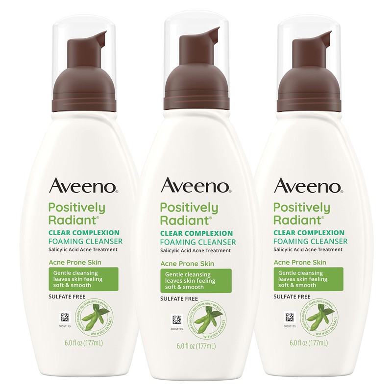 - Aveeno Positively Radiant Clear Complexion Foaming Cleanser for acne-prone skin gently cleanses uneven, dull skin to leave it feeling soft and smooth, making it the perfect addition to your daily skincare routine