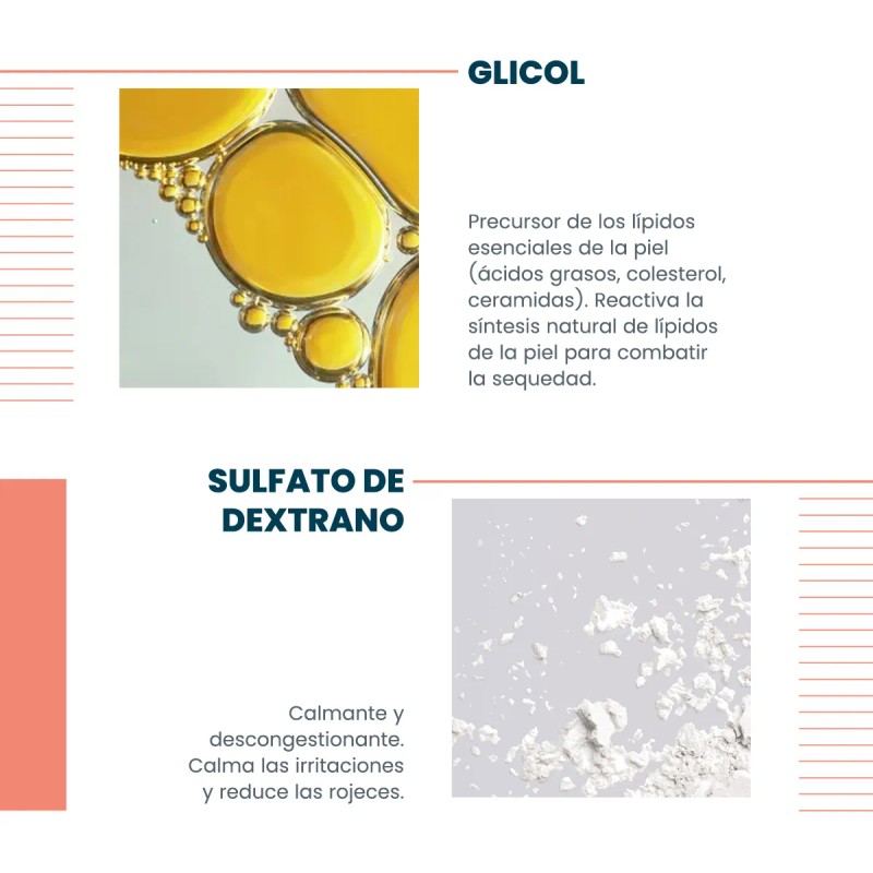 - ACTIVOS CLAVE COMO GLICOL Y SULFATO DE DEXTRANO: Contribuyen a calmar y descongestionar la piel reduciendo rojeces.