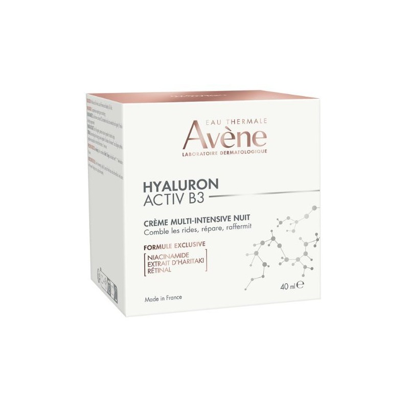 Avene Hyaluron Activ B3 Multi-Intensive Night Cream is a restorative care product containing 4 active ingredients: retinal, niacinamide, hyaluronic acid and Haritaki.