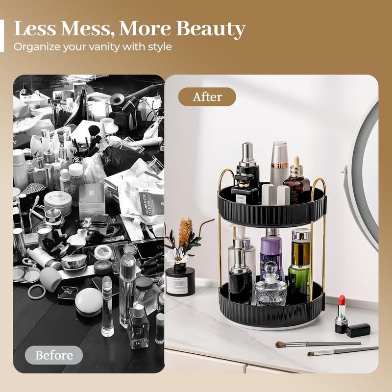 - ???360?Rotating Design?Unlike conventional vanity makeup organizers, this innovative rotating organizer boasts a seamless 360-degree rotation capability. With just a gentle rotation, you can effortlessly access all your makeup essentials, making the selection process a breeze. The perfume organizer's high tray edge are thoughtfully designed to prevent any messy spills.