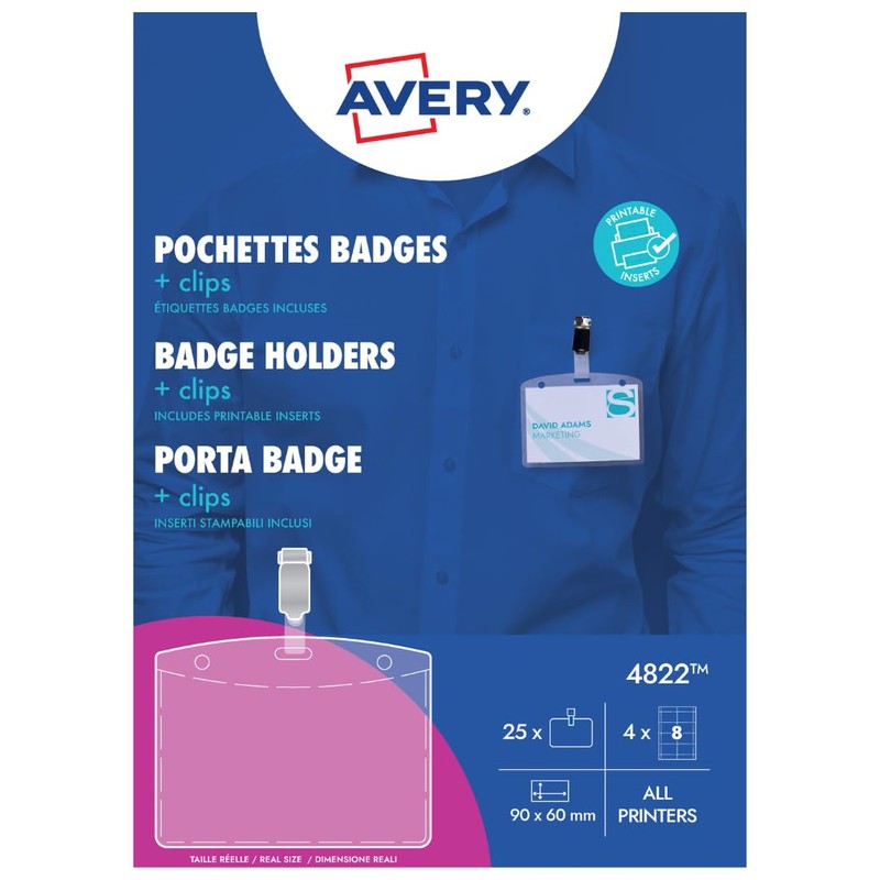 Avery 4822 Clip Badge Holders with Printable and Customisable Name Inserts (90 x 60 mm Badges) - White, Pack of 25