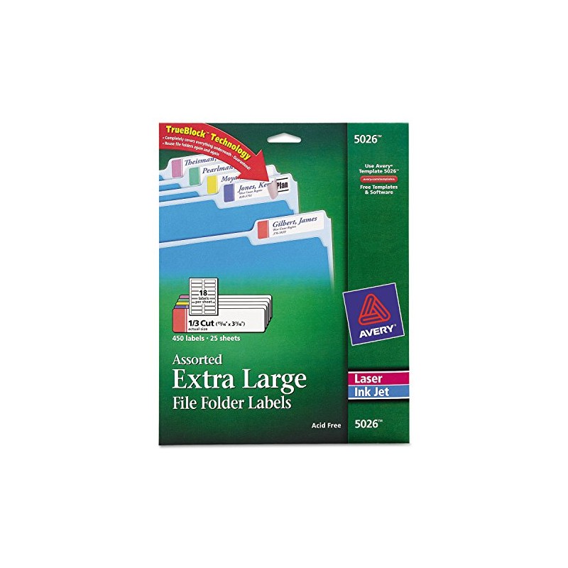 Avery 5026 X-Large File Folder Labels, 1/3 Cut, 15/16 x 3-7/16, Assorted, 450/PK