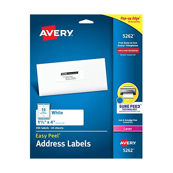 Avery Address Labels with Sure Feed for Laser Printers, 1-1/3" x 4", 350 Labels, Permanent Adhesive (5262), White