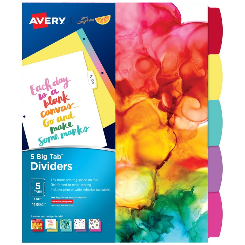 Give your paper organization a fun and stylish look with Amy Tangerine Designer Collection Big Tab Fashion Dividers featuring the Rainbow Vibes design. Big Tabs have 1.5 times more writing space than standard tabs. Fashionable dividers display five different preprinted designs and bright, colorful tabs, so each divider has a unique look. Dividers are three-hole punched with reinforced holes for extra durability. Print or write on the included adhesive tab labels to customize the dividers.
