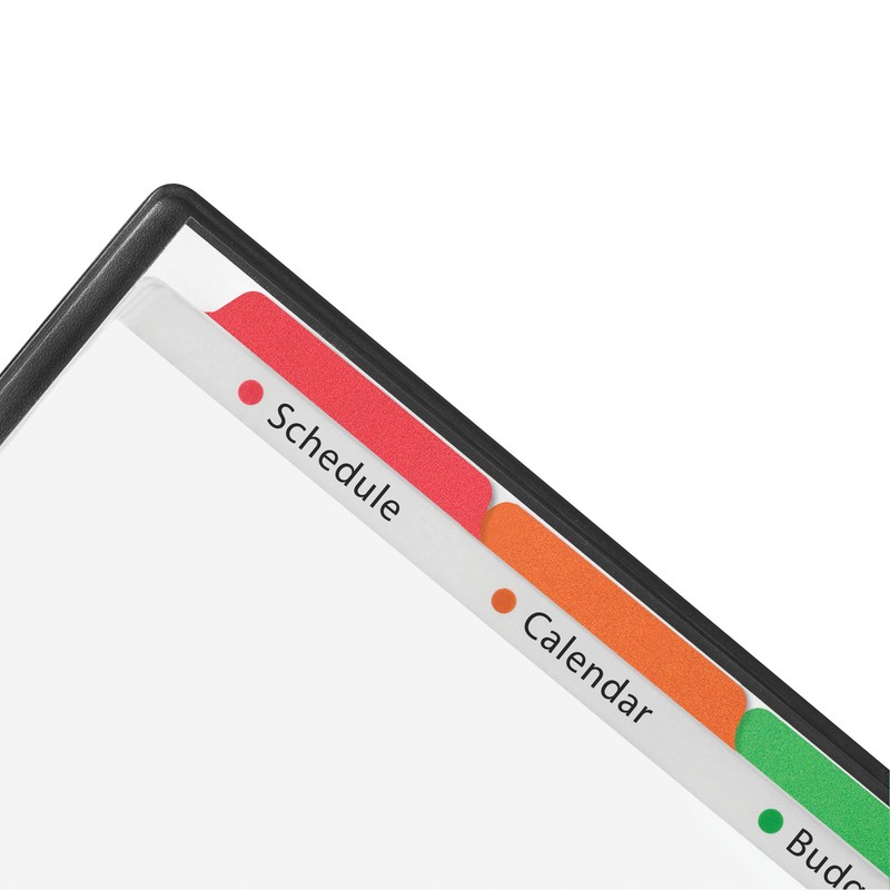 - Los separadores de carpetas con pestañas y protector de hojas trabajan juntos para proporcionar un aspecto limpio y profesional