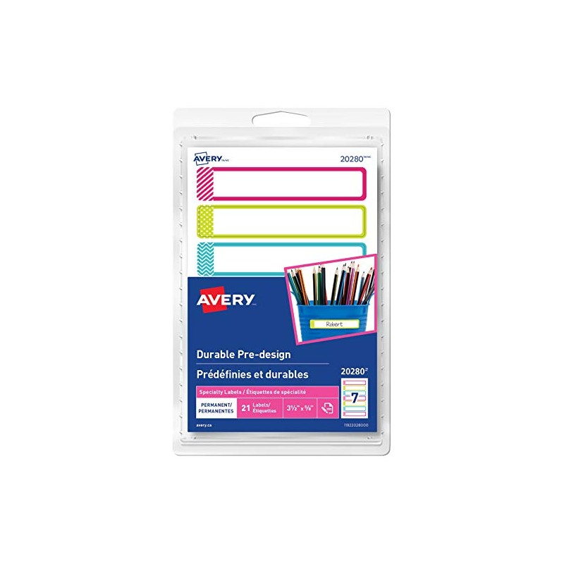 Avery Durable Labels for Kids School Gear, Rectangle, 3.5" X 5/8", Hand Write, Assorted Colours, Permanent, 21 Labels (20280)