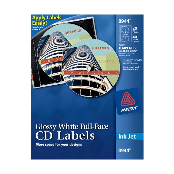 Avery Full-Face CD Labels for Inkjet Printers, Glossy White, 20 Disc Labels and 40 Spine Labels (8944)