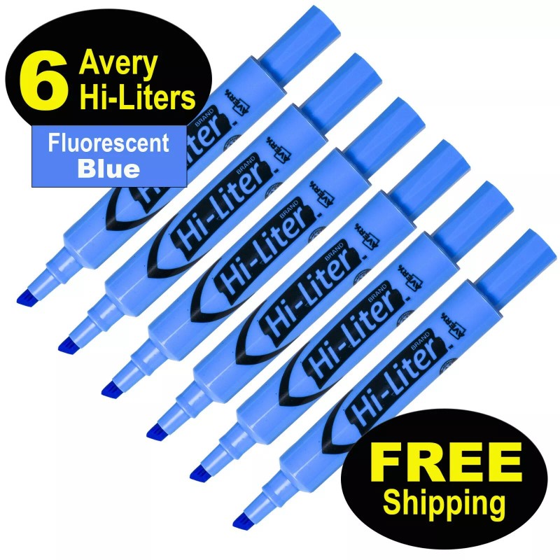 Pack of 6 Hi-Liters. Avery Hi-Liter 24016 Fluorescent Blue, Chisel Tip. Call out bright ideas with this HI-LITER that lets you mark key words and phrases with brilliant fluorescent, nontoxic color. The molded chisel tip lets you highlight or underline, and the plastic tip won't fray or mush. A faceted barrel provides a comfortable grip, so you can easily use the highlighter as you mark documents, notes, books and more. The improved formula means you can leave the cap off for up to a week and still highlight with ease. Trust the original. Highlighters contain quick drying, nontoxic ink. ACMI certified (conforms to ASTM D-4236).