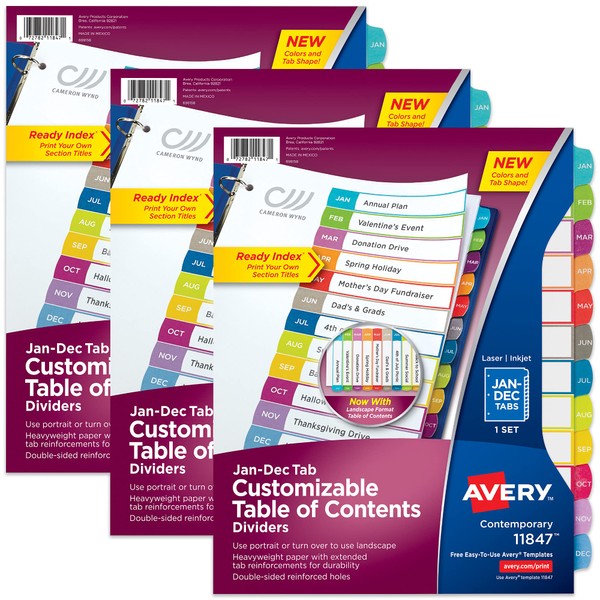 Avery Jan-Dec Customizable Table of Contents Dividers for 3 Ring Binders, 12-Tab Sets, Multicolor, 3 Binder Divider Sets (01741)