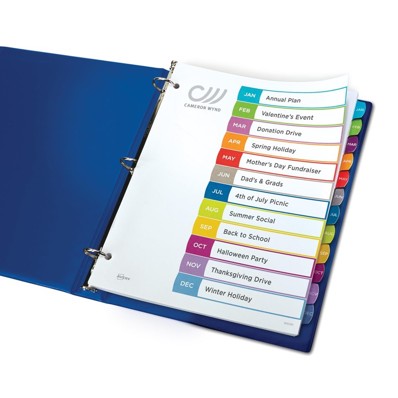 - Get your year in order with this coordinated system of a table of contents page and matching 12-tab set of preprinted tabbed dividers for 3 ring binders
