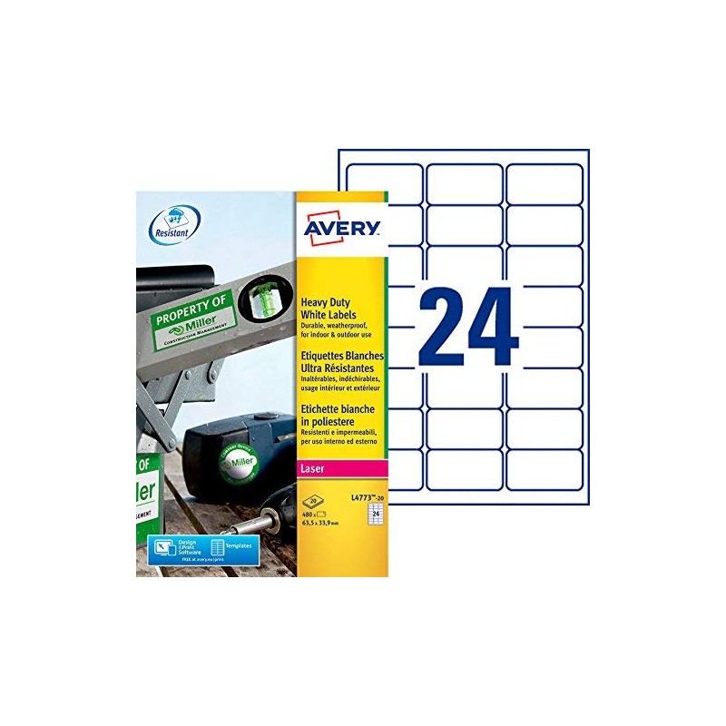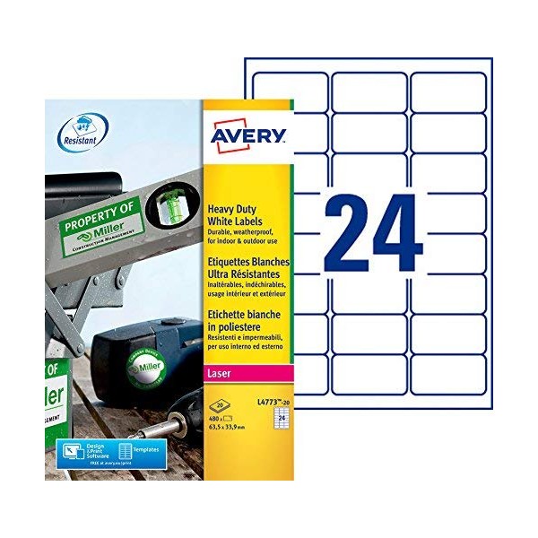 Avery L4773-20 480x Ultra-Resistant Labels 63.5 x 33.9 mm White for Laser Printers