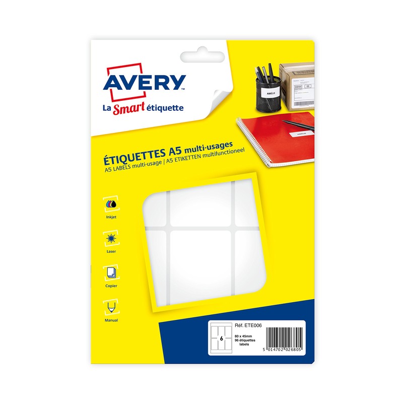 Avery Multi-Purpose Labels 6 per sheet (96) – 80x45 mm A5 Sheet (ete006)