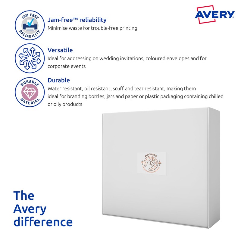 - Avery Crystal Clear Addressing Labels are made with a durable premium glossy clear material that is 100% transparent and ideal for envelopes, letters, product labelling or even pantry labels and kitchen labels.