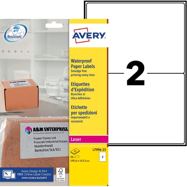 Avery Printable, Customisable Weatherproof/Waterproof, Parcel Mailing Labels, Laser Printers, L7996-25, White, 2 Per A4 Sheet.