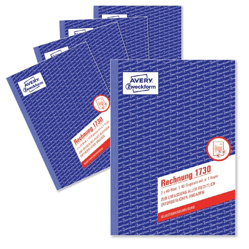 AVERY Zweckform 1730-5 Rechnung (A5, 2x40 Blatt, selbstdurchschreibend mit farbigem Durchschlag, enthält alle vom Finanzamt geforderten Angaben) 5er Pack, weiß/gelb
