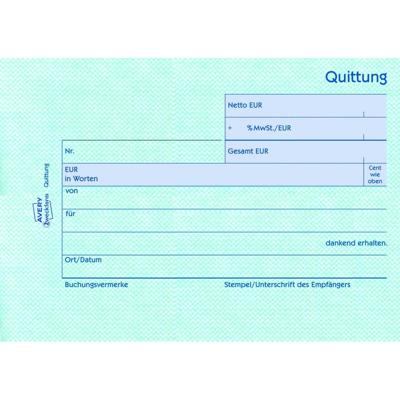 AVERY Zweckform 302 Quittungsblock (A6 quer, 50 Blatt, mit Ausfüllhilfe, fälschungssicherer Dokumentendruck, für Beträge über 250€ mit separater MwSt., für DE/AT) weiß