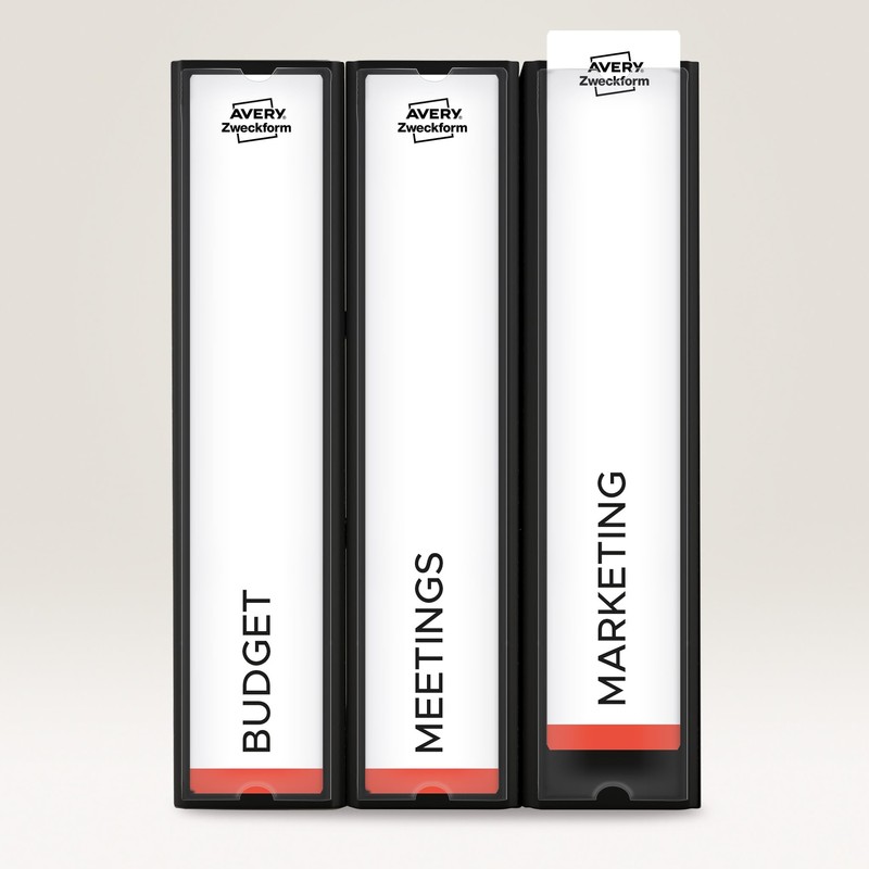 • For folders with spine label pocket: for frequent change of labeling & reuse. Short, wide format (54 x 190 mm) suitable for wide folders of popular folder brands such as Leitz, Elba