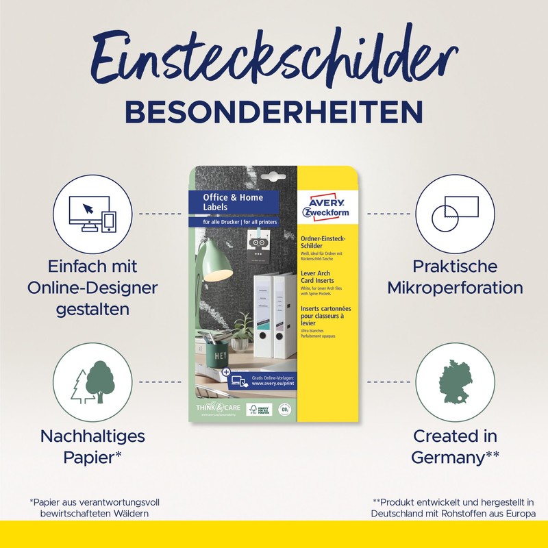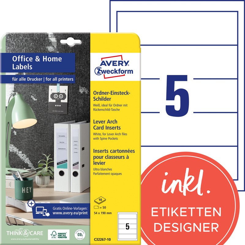 • For wide folders of all common folder systems such as Leitz and Elba - folder spine signs design and print yourself with free online templates from AVERY Zweckform