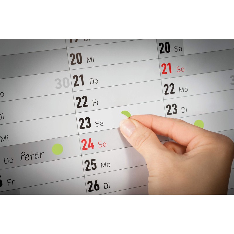 - Coloured round stickers available in small and large sizes, ideal for scheduling appointments and holidays on wall calendars or for labelling certain products such as quality control or inventory